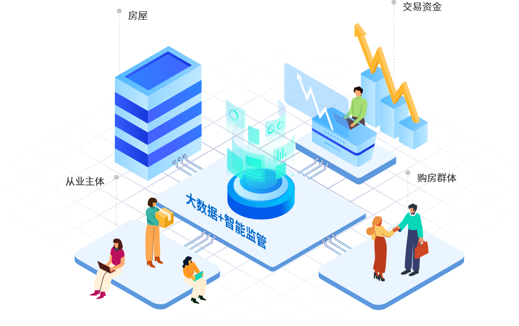 海迈科技商品房市场监管解决方案,通过形成宏微观统一、“地、楼、房”一体的楼盘表基础数据,全面涵盖商品房规划、建设投资、销售管理、公积金管理、二手房租售交易和物业管理的业务监管过程,监管范畴包括房屋、从业主体、交易资金和购房群体四大方面,形成综合大数据中心。