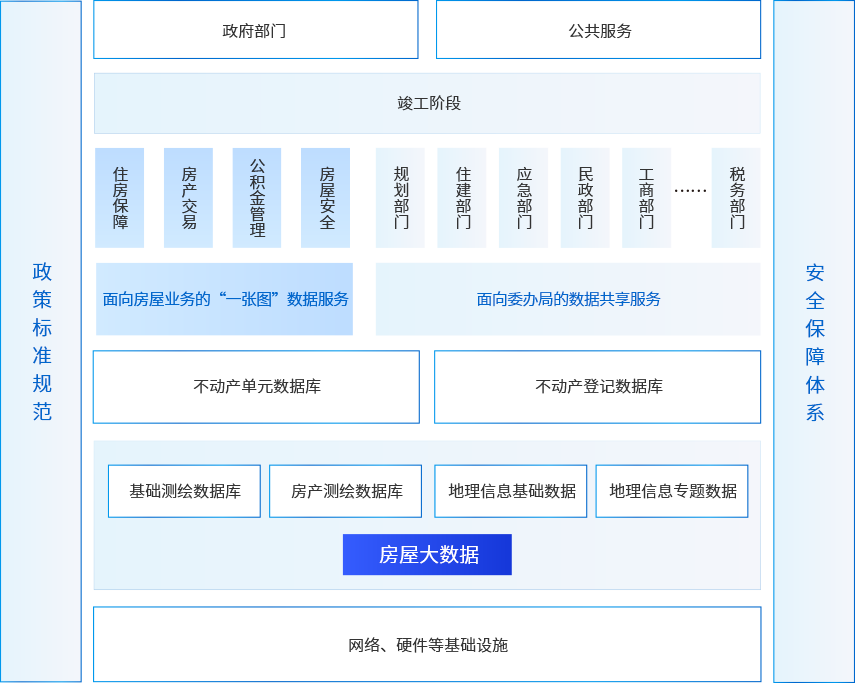 在此基础上,为住房保障、房屋交易、房屋租赁、公积金服务、房屋安全等业务提供基础数据服务;构建“房屋一张图”数据服务系列,为相关政策制定提供决策数据支撑;为规划、住建、应急、民政、工商、税务、公安、社保、财政等部门提供数据共享服务;为打通房屋规划、建设、管理、不动产登记各环节创造基础条件;以房屋公共基础数据为核心,整合市政府各职能部门的业务成果数据;构建“1个房屋公共基础数据库+N个房屋业务专题数据库”,建设具有弹性扩展能力的房屋业务数据中心。