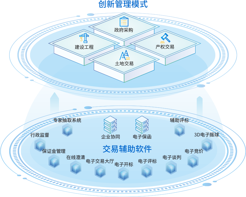 方案提供丰富的专业能力支持,包括建设工程招标投标、政府采购、土地矿业交易、产权交易、小规模建设工程、小规模企业采购业务等领域;提供公开招标、邀请招标、单一来源采购、询价、竞争性谈判、竞争性磋商、竞价、拍卖等多种交易方式;内置大量的招标或采购文件范本;支持建设工程BIM招标投标;支持资格预审和资格后审;支持多信封、两步法等交易办法,实现公共资源交易的全过程电子化。